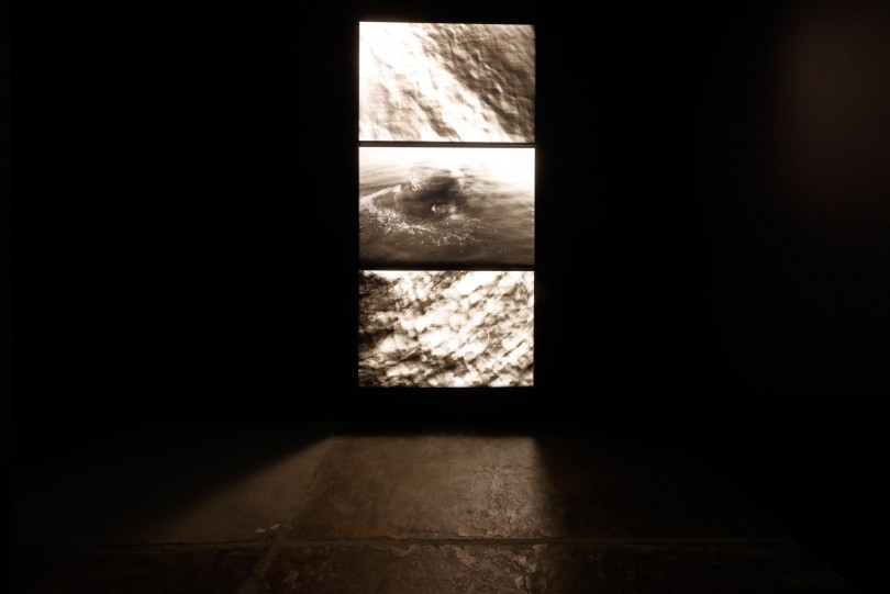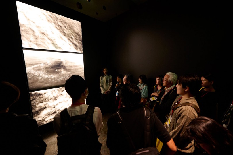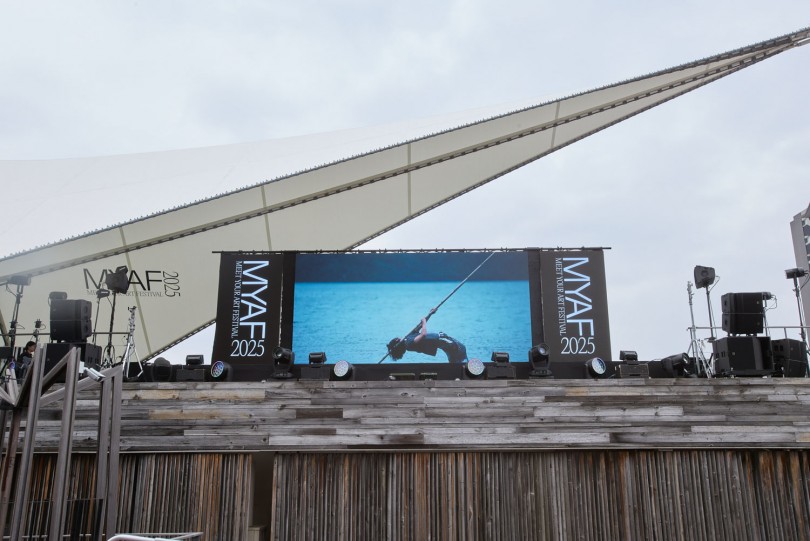 琵琶湖で森山未來が近江のマレビトになり、そのパフォーマンスを写真家・濱田裕史が記録した写真作品《湖独の舞》が展示されました。近江ARS TOKYOの冒頭に映し出された映像は、映像ディレクターのMESSによるもの。こちらは屋外船上ステージの巨大スクリーンにて上映されました。